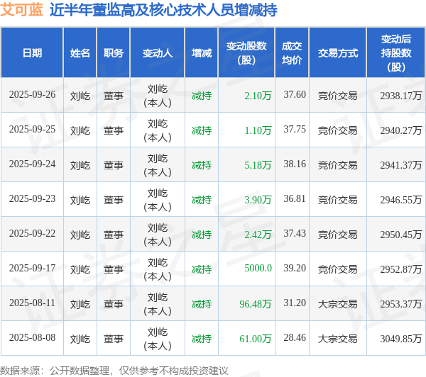 艾可蓝近半年内的董监高及核心技术人员增减持详情如下: