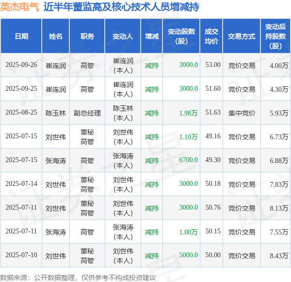 英杰电气近半年内的董监高及核心技术人员增减持详情如下: