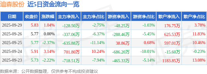 证券之星消息,截至2025年9月29日收盘,迪森股份(300335)报收于5.83元,上涨1.04%,换手率2.1%,成交量8.07万手,成交额4677.1万元。