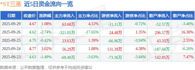 证券之星消息,截至2025年9月29日收盘,*ST三圣(002742)报收于4.67元,上涨1.08%,换手率0.76%,成交量3.3万手,成交额1545.53万元。