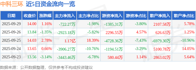 证券之星消息,截至2025年9月29日收盘,中科三环(000970)报收于14.0元,上涨1.16%,换手率2.16%,成交量26.26万手,成交额3.65亿元。