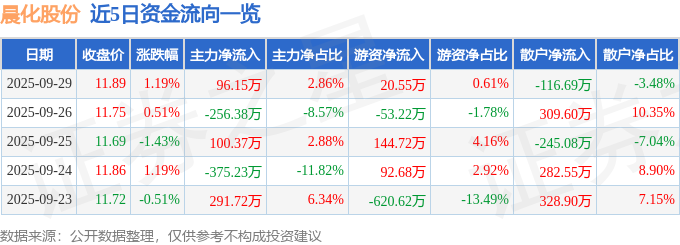 证券之星消息,截至2025年9月29日收盘,晨化股份(300610)报收于11.89元,上涨1.19%,换手率1.76%,成交量2.84万手,成交额3356.01万元。