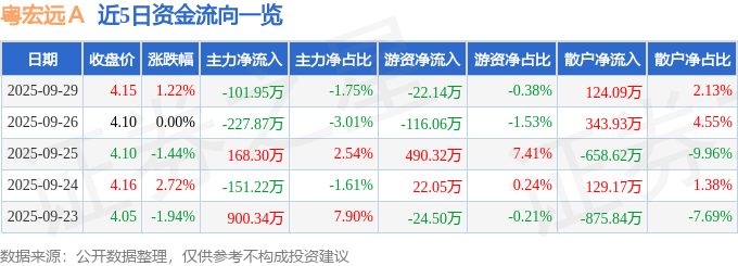 证券之星消息,截至2025年9月29日收盘,粤宏远A(000573)报收于4.15元,上涨1.22%,换手率2.24%,成交量14.18万手,成交额5837.17万元。