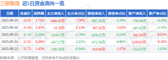 证券之星消息,截至2025年9月29日收盘,三联锻造(001282)报收于22.01元,上涨1.71%,换手率11.07%,成交量8.65万手,成交额1.9亿元。