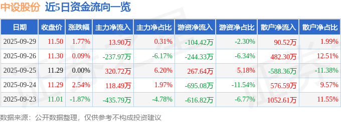 证券之星消息,截至2025年9月29日收盘,中设股份(002883)报收于11.5元,上涨1.77%,换手率2.6%,成交量3.98万手,成交额4547.23万元。