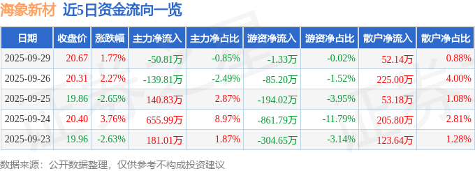 证券之星消息,截至2025年9月29日收盘,海象新材(003011)报收于20.67元,上涨1.77%,换手率3.72%,成交量2.9万手,成交额5958.24万元。