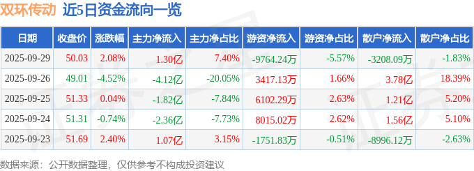 证券之星消息,截至2025年9月29日收盘,双环传动(002472)报收于50.03元,上涨2.08%,换手率4.68%,成交量35.3万手,成交额17.54亿元。