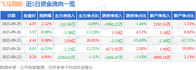 证券之星消息,截至2025年9月29日收盘,飞马国际(002210)报收于4.07元,上涨2.52%,换手率13.5%,成交量358.52万手,成交额14.34亿元。