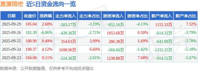 证券之星消息,截至2025年9月29日收盘,夏厦精密(001306)报收于105.04元,上涨2.68%,换手率9.71%,成交量1.51万手,成交额1.58亿元。