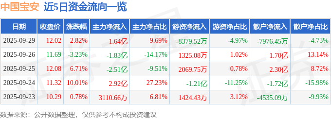 证券之星消息,截至2025年9月29日收盘,中国宝安(000009)报收于12.02元,上涨2.82%,换手率5.44%,成交量140.03万手,成交额16.88亿元。