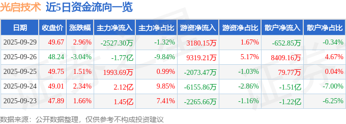 证券之星消息,截至2025年9月29日收盘,光启技术(002625)报收于49.67元,上涨2.96%,换手率1.8%,成交量38.73万手,成交额19.08亿元。