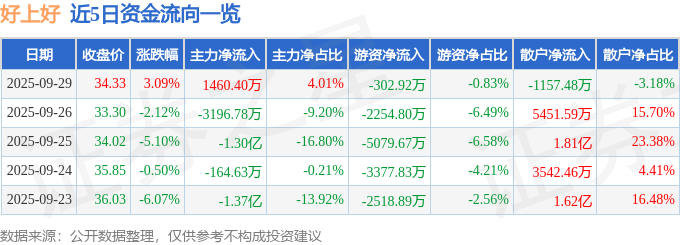证券之星消息,截至2025年9月29日收盘,好上好(001298)报收于34.33元,上涨3.09%,换手率6.94%,成交量10.69万手,成交额3.64亿元。