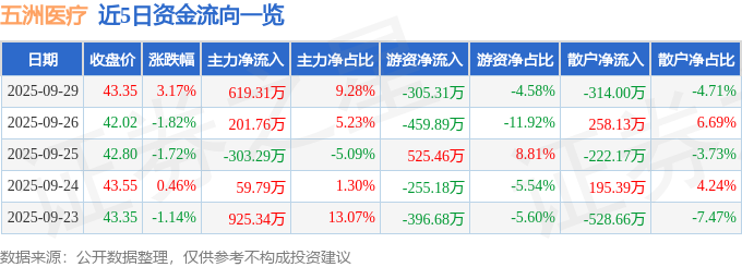 证券之星消息,截至2025年9月29日收盘,五洲医疗(301234)报收于43.35元,上涨3.17%,换手率2.28%,成交量1.55万手,成交额6672.51万元。
