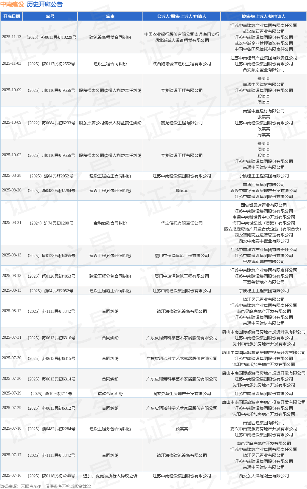 案号:(2025)川0116民初9556号根据统计,近一年内以江苏中南建设集团股份有限公司为当事人的历史开庭公告有163则,其中案由为“合同纠纷”的公告以34则居首,其次为“买卖合同纠纷”有18则,“建设工程分包合同纠纷”有11则。历史开庭公告(前20条)如下: