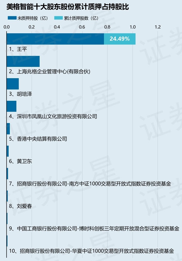 截止本公告日,股东王平已累计质押股份2508.0万股,占其持股总数的24.49%。本次质押后美格智能十大股东的累计质押股份占持股比例(占持股比例的计算以公司最新一期财务报表公布的十大股东的持股总数为基准)见下图: