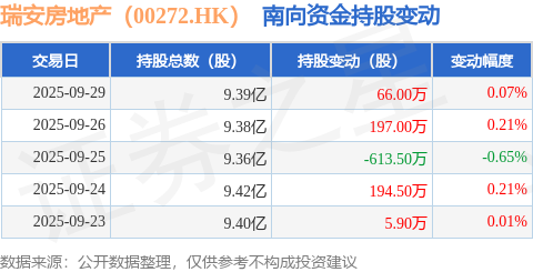 证券之星消息,9月29日南向资金增持66.0万股瑞安房地产(00272.HK)。近5个交易日中,获南向资金减持的有1天,累计净减持150.1万股。近20个交易日中,获南向资金减持的有8天,累计净减持779.95万股。截至目前,南向资金持有瑞安房地产(00272.HK)9.39亿股,占公司已发行普通股的11.69%。