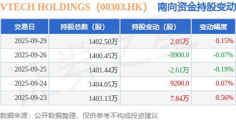 证券之星消息,9月29日南向资金增持2.05万股VTECH HOLDINGS(00303.HK)。近5个交易日中,获南向资金增持的有3天,累计净增持7.21万股。近20个交易日中,获南向资金减持的有10天,累计净减持13.94万股。截至目前,南向资金持有VTECH HOLDINGS(00303.HK)1402.5万股,占公司已发行普通股的5.53%。