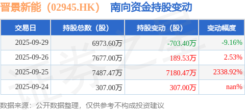 证券之星消息,9月29日南向资金减持703.4万股晋景新能(02945.HK)。截至目前,南向资金持有晋景新能(02945.HK)6973.6万股,占公司已发行普通股的2.51%。