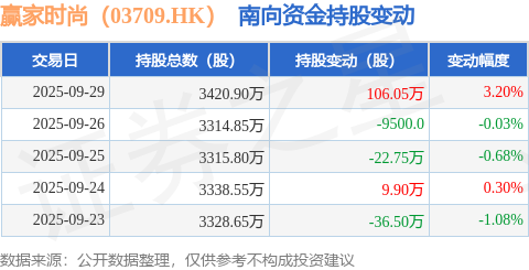 证券之星消息,9月29日南向资金增持106.05万股赢家时尚(03709.HK)。近5个交易日中,获南向资金增持的有2天,累计净增持55.75万股。近20个交易日中,获南向资金增持的有5天,累计净增持523.85万股。截至目前,南向资金持有赢家时尚(03709.HK)3420.9万股,占公司已发行普通股的4.85%。