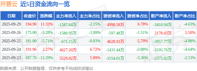 证券之星消息,截至2025年9月29日收盘,开普云(688228)报收于194.9元,上涨11.33%,换手率5.83%,成交量3.94万手,成交额7.37亿元。