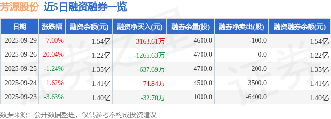 芳源股份融资融券信息显示,融资方面,当日融资买入7202.91万元,融资偿还4034.3万元,融资净买入3168.61万元。融券方面,融券卖出1300.0股,融券偿还1400.0股,融券余量4600.0股,融券余额3.3万元。融资融券余额1.54亿元。