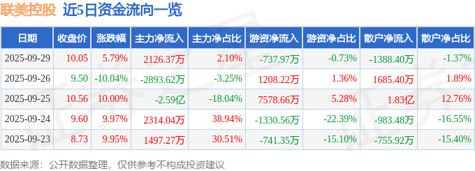 证券之星消息,截至2025年9月29日收盘,联美控股(600167)报收于10.05元,上涨5.79%,换手率4.41%,成交量99.74万手,成交额10.13亿元。