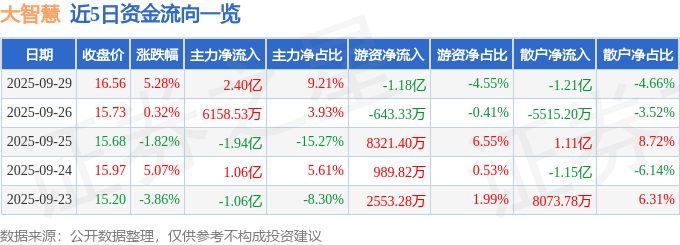 证券之星消息,截至2025年9月29日收盘,大智慧(601519)报收于16.56元,上涨5.28%,换手率8.02%,成交量159.58万手,成交额26.03亿元。