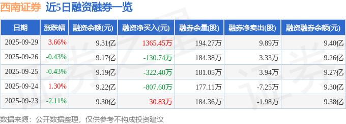 西南证券融资融券信息显示,融资方面,当日融资买入6164.7万元,融资偿还4799.25万元,融资净买入1365.45万元。融券方面,融券卖出22.39万股,融券偿还12.5万股,融券余量194.27万股,融券余额936.38万元。融资融券余额9.4亿元。