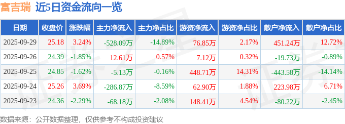 证券之星消息,截至2025年9月29日收盘,富吉瑞(688272)报收于25.18元,上涨3.24%,换手率1.88%,成交量1.43万手,成交额3547.54万元。