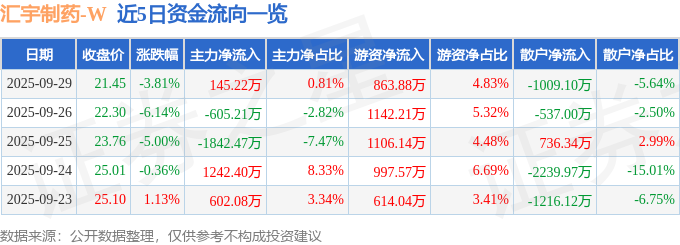 证券之星消息,截至2025年9月29日收盘,汇宇制药(688553)报收于21.45元,下跌3.81%,换手率2.42%,成交量8.32万手,成交额1.79亿元。