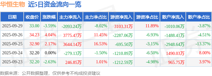 证券之星消息,截至2025年9月29日收盘,华恒生物(688639)报收于33.0元,下跌3.59%,换手率3.15%,成交量7.88万手,成交额2.61亿元。