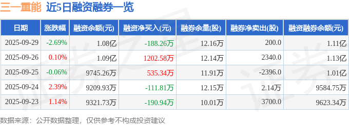 三一重能融资融券信息显示,融资方面,当日融资买入2279.2万元,融资偿还2467.46万元,融资净偿还188.26万元。融券方面,融券卖出600.0股,融券偿还400.0股,融券余量12.16万股,融券余额365.3万元。融资融券余额1.11亿元。