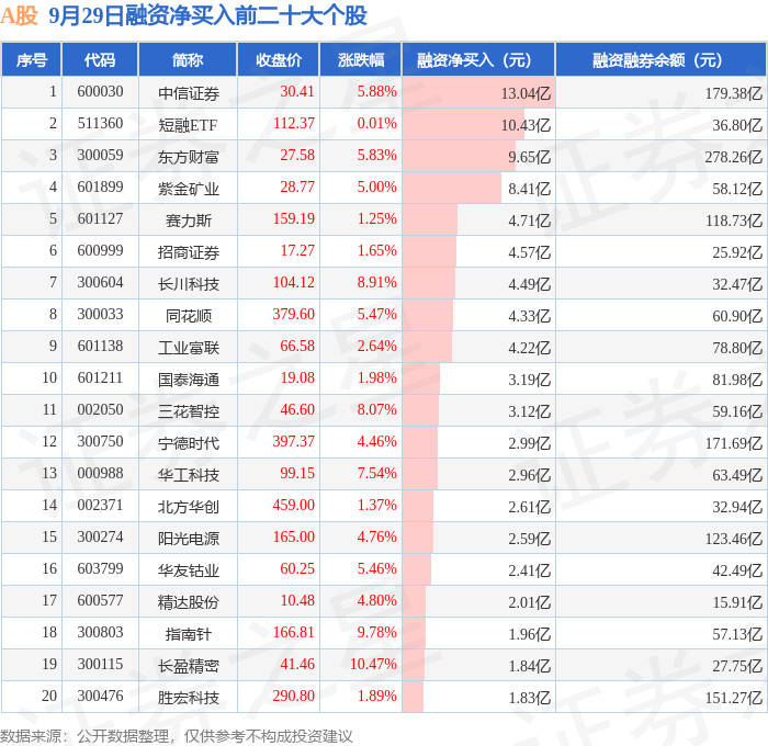 A股融资净买入前三分别为:中信证券(600030)融资净买入13.04亿元、短融ETF(511360)融资净买入10.43亿元、东方财富(300059)融资净买入9.65亿元,前20具体见下表:
