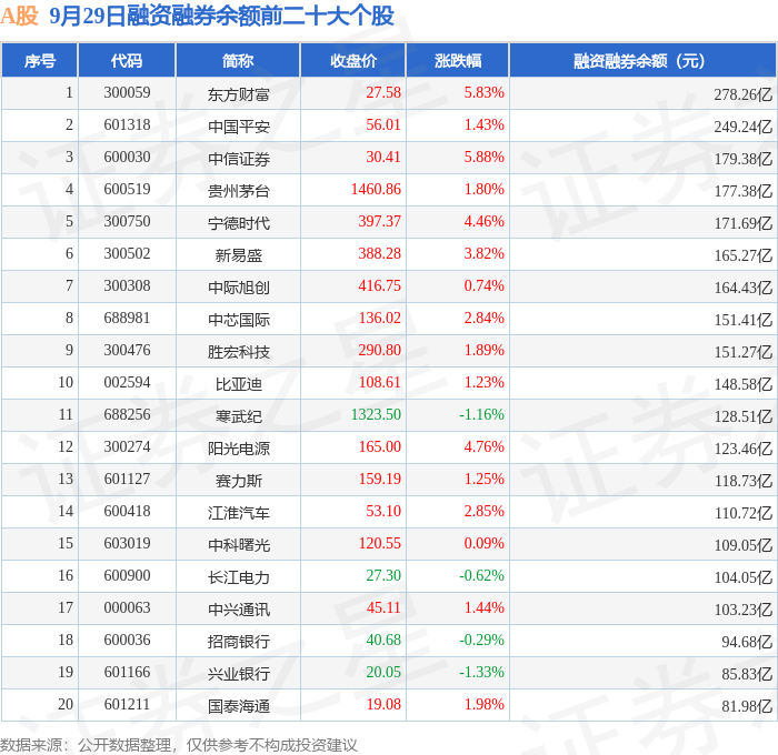 A股融资融券余额前三分别为:东方财富(300059)融资融券余额278.26亿元、中国平安(601318)融资融券余额249.24亿元、中信证券(600030)融资融券余额179.38亿元,前20具体见下表: