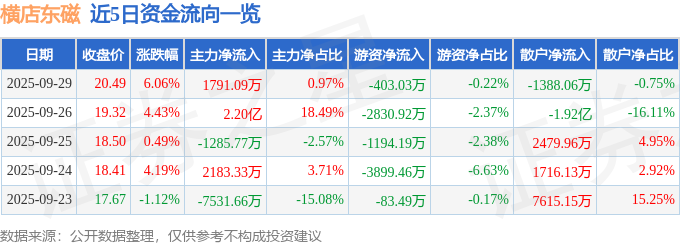 证券之星消息,截至2025年9月29日收盘,横店东磁(002056)报收于20.49元,上涨6.06%,换手率5.51%,成交量89.59万手,成交额18.4亿元。