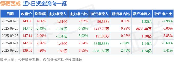 9月29日的资金流向数据方面,主力资金净流入1.31亿元,占总成交额7.92%,游资资金净流入96.53万元,占总成交额0.06%,散户资金净流出1.32亿元,占总成交额7.98%。