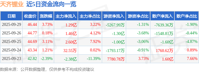 证券之星消息,截至2025年9月29日收盘,天齐锂业(002466)报收于46.44元,上涨3.73%,换手率5.92%,成交量87.43万手,成交额40.14亿元。