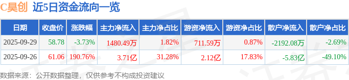 证券之星消息,截至2025年9月29日收盘,C昊创(301668)报收于58.78元,下跌3.73%,换手率62.31%,成交量14.36万手,成交额8.15亿元。