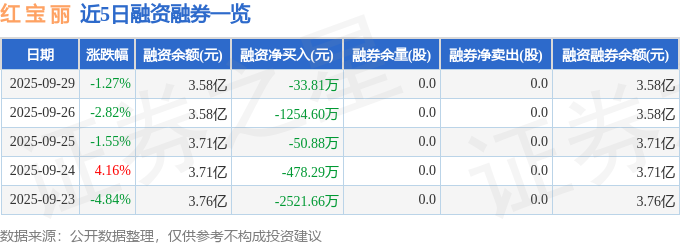 红 宝 丽融资融券信息显示,融资方面,当日融资买入1636.21万元,融资偿还1670.02万元,融资净偿还33.81万元。融券方面,融券卖出0.0股,融券偿还0.0股,融券余量0.0股,融券余额0.0万元。融资融券余额3.58亿元。