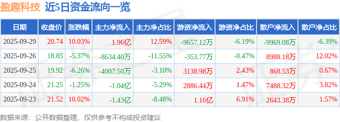 证券之星消息,截至2025年9月29日收盘,盈趣科技(002925)报收于20.74元,上涨10.03%,涨停,换手率10.29%,成交量75.72万手,成交额15.59亿元。
