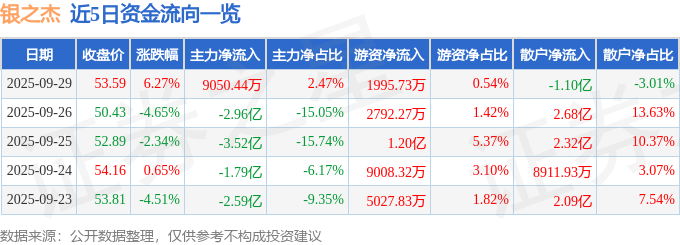证券之星消息,截至2025年9月29日收盘,银之杰(300085)报收于53.59元,上涨6.27%,换手率10.65%,成交量69.44万手,成交额36.69亿元。