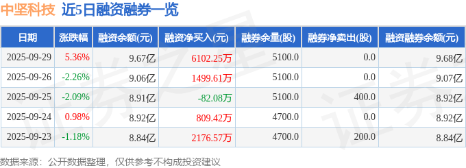 中坚科技融资融券信息显示,融资方面,当日融资买入1.12亿元,融资偿还5089.7万元,融资净买入6102.25万元。融券方面,融券卖出100.0股,融券偿还100.0股,融券余量5100.0股,融券余额66.39万元。融资融券余额9.68亿元。