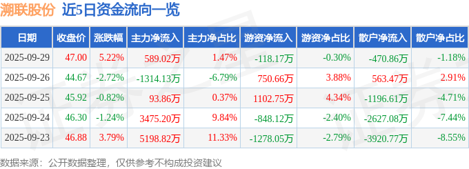 证券之星消息,截至2025年9月29日收盘,溯联股份(301397)报收于47.0元,上涨5.22%,换手率12.16%,成交量8.61万手,成交额4.0亿元。