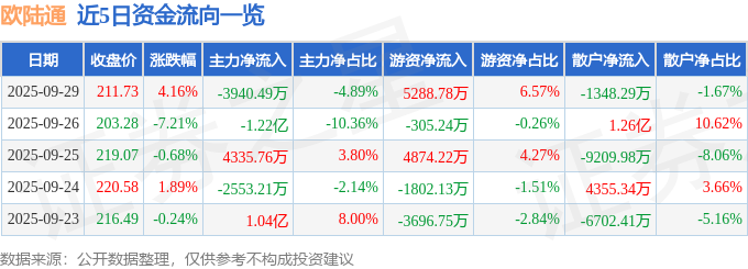 证券之星消息,截至2025年9月29日收盘,欧陆通(300870)报收于211.73元,上涨4.16%,换手率3.51%,成交量3.86万手,成交额8.06亿元。
