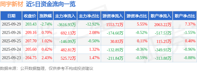 证券之星消息,截至2025年9月29日收盘,同宇新材(301630)报收于203.43元,下跌2.74%,换手率13.61%,成交量1.36万手,成交额2.8亿元。