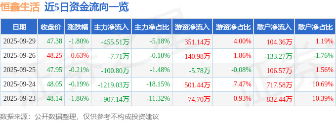 证券之星消息,截至2025年9月29日收盘,恒鑫生活(301501)报收于47.38元,下跌1.8%,换手率5.02%,成交量1.86万手,成交额8785.75万元。
