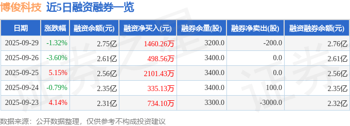 博俊科技融资融券信息显示,融资方面,当日融资买入3831.48万元,融资偿还2371.21万元,融资净买入1460.26万元,连续3日净买入累计4060.26万元。融券方面,融券卖出0.0股,融券偿还200.0股,融券余量3200.0股,融券余额10.06万元。融资融券余额2.76亿元。