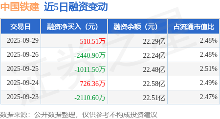 证券之星消息,9月29日,中国铁建(601186)融资买入4617.53万元,融资偿还4099.02万元,融资净买入518.51万元,融资余额22.29亿元。