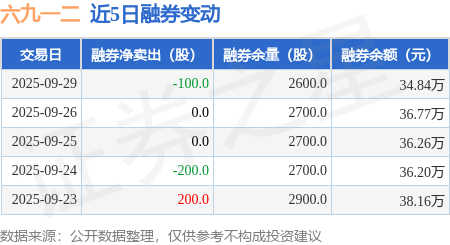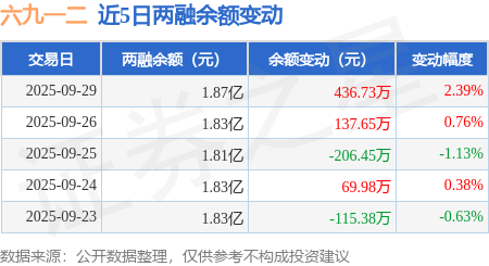 证券之星消息,9月29日,六九一二(301592)融资买入1269.72万元,融资偿还831.07万元,融资净买入438.65万元,融资余额1.87亿元。