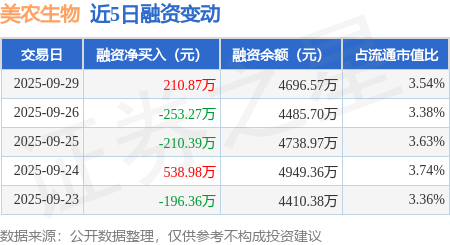 证券之星消息,9月29日,美农生物(301156)融资买入417.78万元,融资偿还206.91万元,融资净买入210.87万元,融资余额4696.57万元。